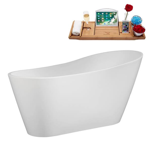 60 in. x 29 in. Acrylic Freestanding Soaking Bathtub in Glossy White With Glossy White Drain, Bamboo Tray