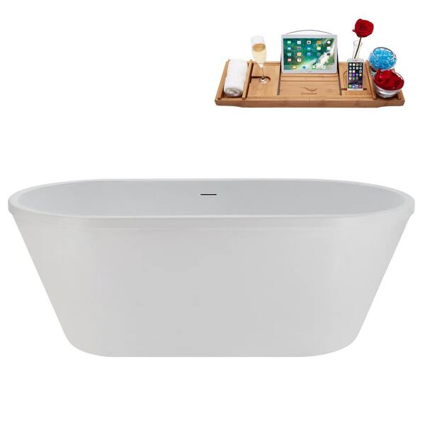 60 in. x 30 in. Acrylic Freestanding Soaking Bathtub in Glossy White with Brushed Gun Metal Drain, Bamboo Tray