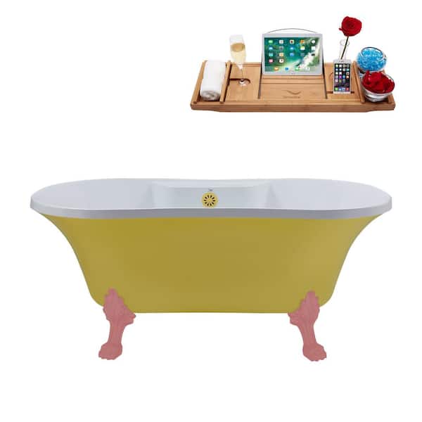 60 in. x 32 in. Acrylic Clawfoot Soaking Bathtub in Matte Yellow with Matte Pink Clawfeet and Polished Gold Drain