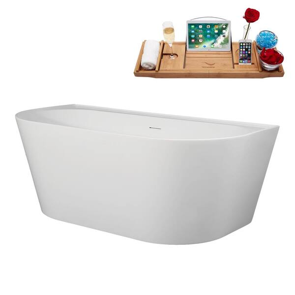 63 in. x 30 in. Acrylic Freestanding Soaking Bathtub in Glossy White With Brushed GunMetal Drain, Bamboo Tray