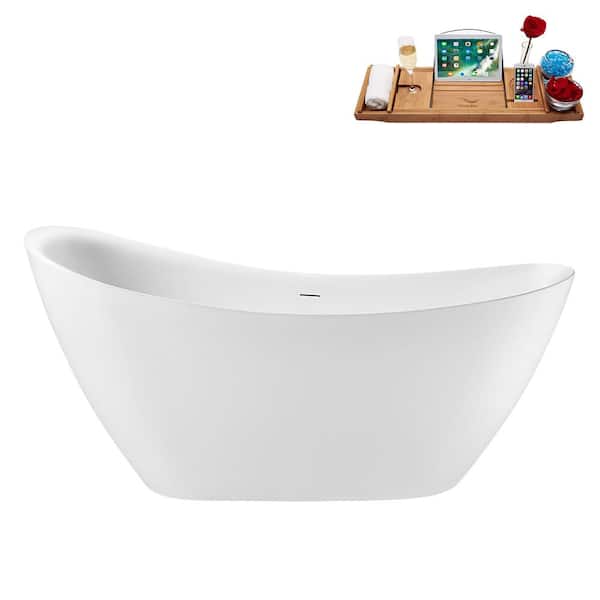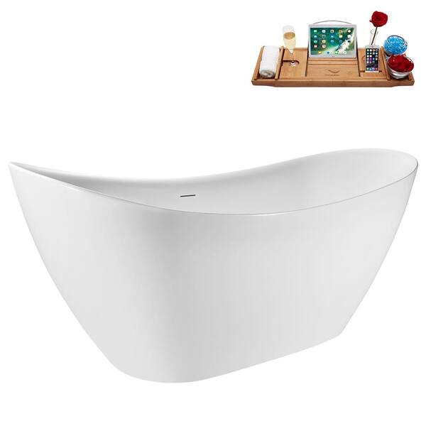 65 in. x 30 in. Acrylic Freestanding Soaking Bathtub in Glossy White with Polished Gold Drain, Bamboo Tray