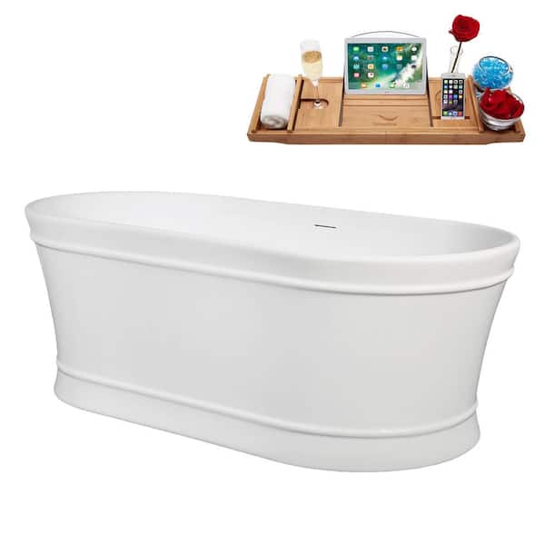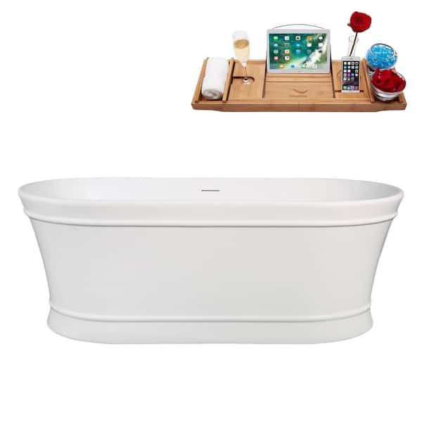 65 in. x 31 in. Acrylic Freestanding Soaking Bathtub in Glossy White With Polished Gold Drain, Bamboo Tray