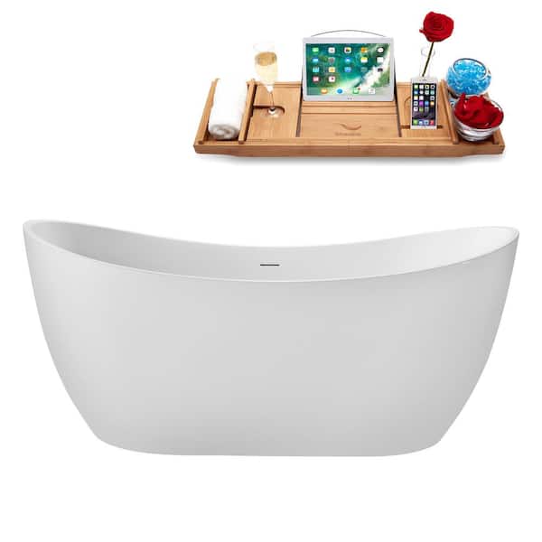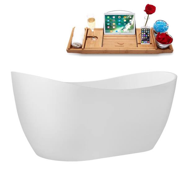 66 in. x 32 in. Acrylic Freestanding Soaking Bathtub in Glossy White with Polished Gold Drain, Bamboo Tray