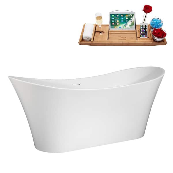 67 in. x 31 in. Acrylic Freestanding Soaking Bathtub in Glossy White With Matte Black Drain, Bamboo Tray