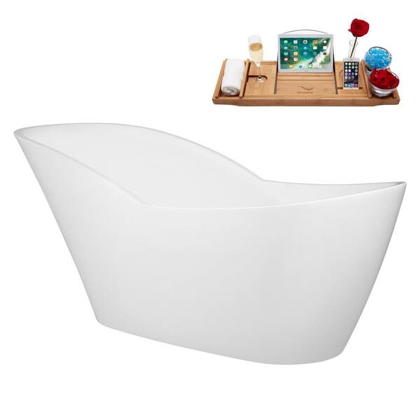 67 in. x 31 in. Acrylic Freestanding Soaking Bathtub in Glossy White with Polished Brass Drain, Bamboo Tray