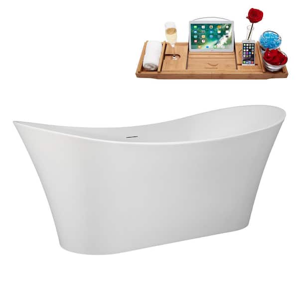 67 in. x 31 in. Acrylic Freestanding Soaking Bathtub in Matte White With Polished Chrome Drain, Bamboo Tray