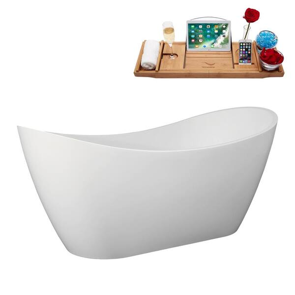 67 in. x 32 in. Acrylic Freestanding Soaking Bathtub in Glossy White With Glossy White Drain, Bamboo Tray