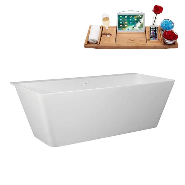 67 in. x 32 in. Acrylic Freestanding Soaking Bathtub in Glossy White With Matte Oil Rubbed Bronze Drain, Bamboo Tray