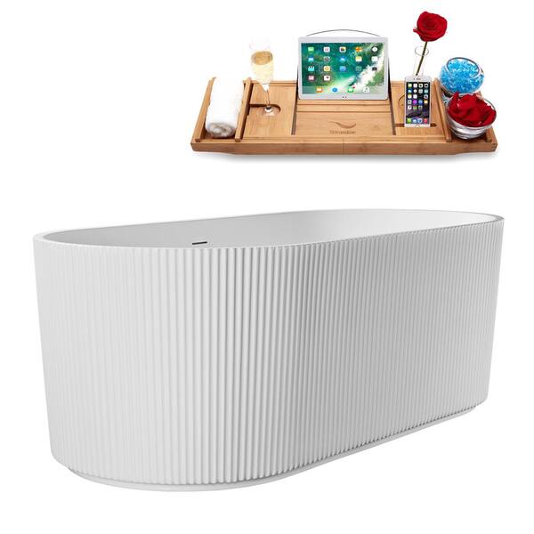 67 in. x 32 in. Acrylic Freestanding Soaking Bathtub in Glossy White with Glossy White Drain, Bamboo Tray