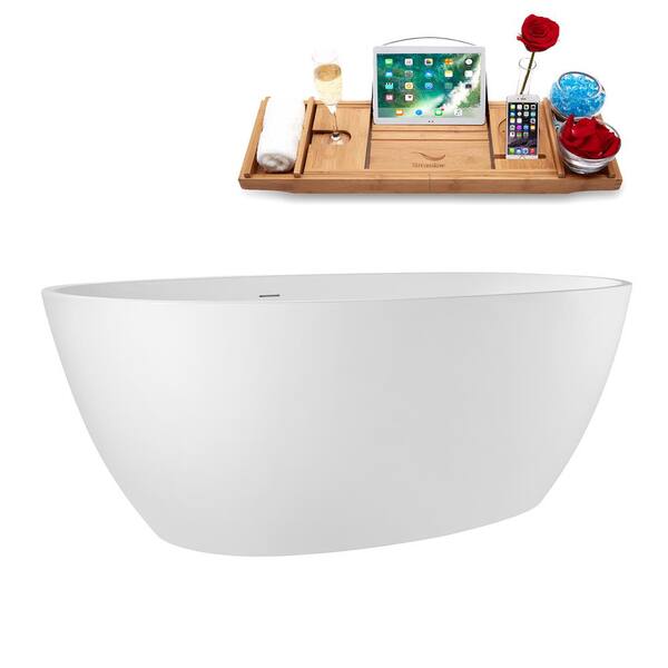 67 in. x 34 in. Acrylic Freestanding Soaking Bathtub in Glossy White with Glossy White Drain, Bamboo Tray