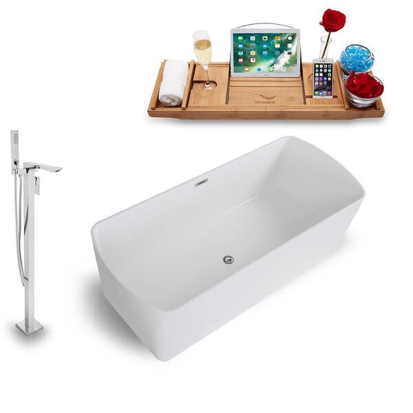 Tub, Faucet, and Tray Set 67 in. Solid Surface Resin Flatbottom Non-Whirpool Bathtub in Glossy White