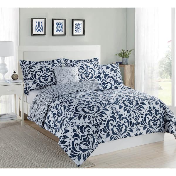 Studio 17 Anson Damask Navy/White 5-Piece Full/Queen Comforter Set