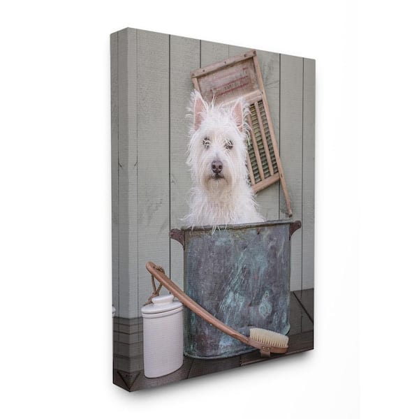 24 in. x 30 in. "Ready for a Bath Little White Dog in a Wash Tub Photograph" by Edward M. Fielding Canvas Wall Art