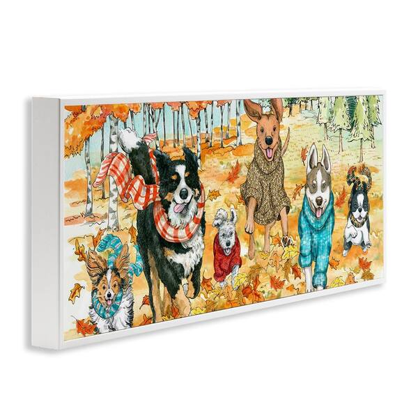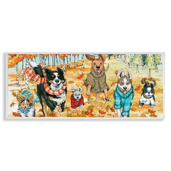 Autumn Dog Park Animals Running by Sherri Buck Baldwin White Framed Graphic Animal Art Print 13 in. x 30 in.