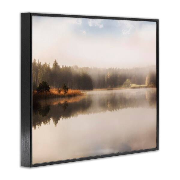 Autumn Lake Mist Landscape Distant Pine Tree Forest by Irene Weisz Black Framed Graphic Nature Art Print 30 in. x 24 in.