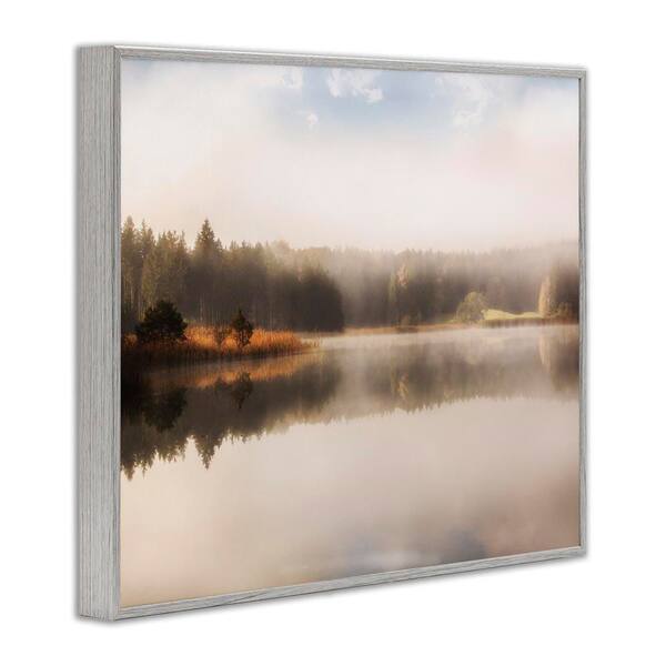 Autumn Lake Misty Landscape Distant Pine Tree Forest by Irene Weisz Gray Framed Graphic Nature Art Print 24 in. x 30 in.