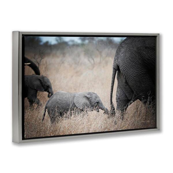 Baby Elephant Strolling by Sharon Vardy Gray Floater Frame Animal Graphic Art Print 17 in. x 25 in.
