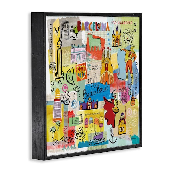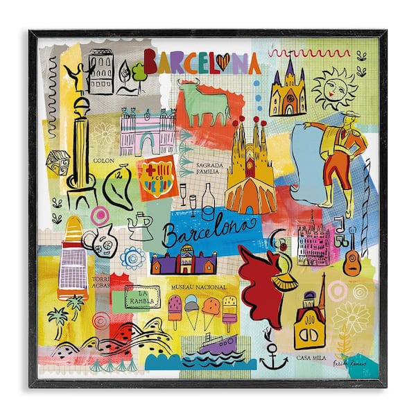 Barcelona Landmarks Spain Traditions by Veronique Charron Black Framed Travel Giclee Art Print 12 in. x 12 in.