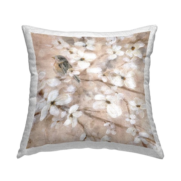 Bird Perched in Flowers Tan Square Outdoor Throw Pillow