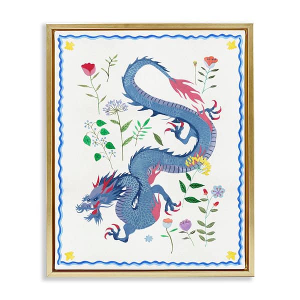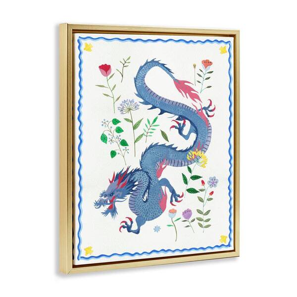 Blue Dragon and Botanicals by Melissa Wang Gold Floater Frame Fantasy Graphic Art Print 31 in. x 25 in.