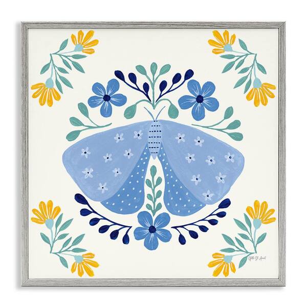 Blue Folk Butterfly by Yvette St. Amant Gray Framed Animal Giclee Art Print 24 in. x 24 in.