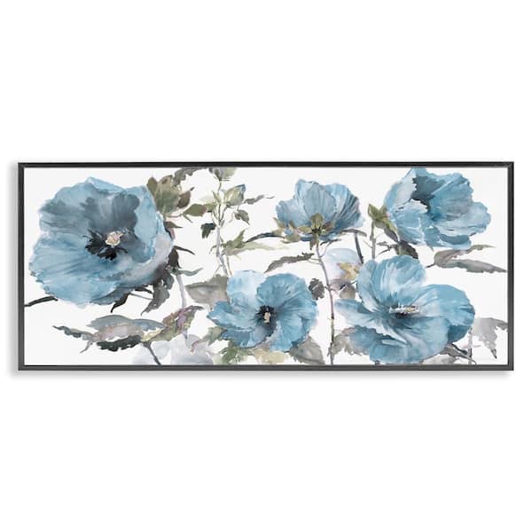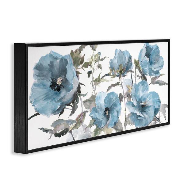 Blue Poppies on White by Theresa Heidel Black Framed Nature Giclee Art Print 13 in. x 30 in.