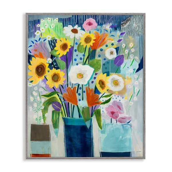 Bright Sunflowers and Blooms by Jill Martin Gray Framed Nature Giclee Art Print 20 in. x 16 in.