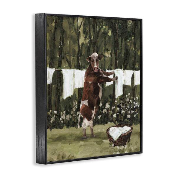 Brown Cow Doing Laundry by White Ladder Black Framed Animal Giclee Art Print 30 in. x 24 in.