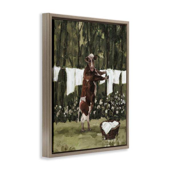 Brown Cow Doing Laundry by White Ladder Brown Floater Frame Animal Graphic Art Print 31 in. x 25 in.