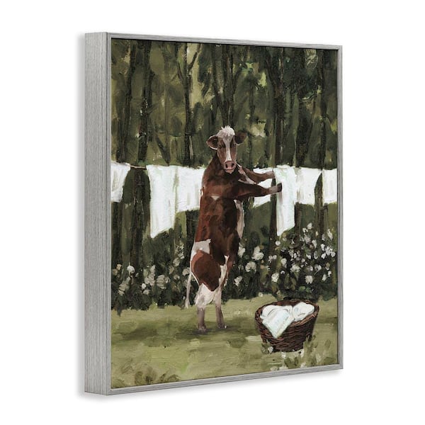 Brown Cow Doing Laundry by White Ladder Gray Framed Animal Giclee Art Print 30 in. x 24 in.