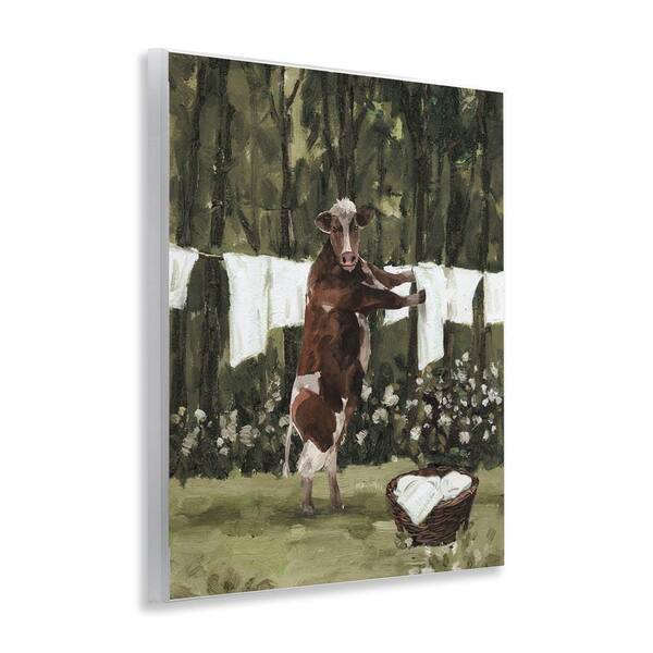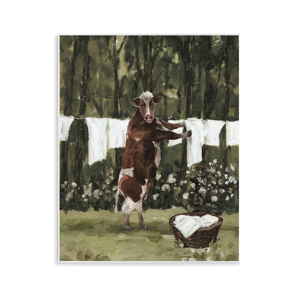 Brown Cow Doing Laundry by White Ladder Unframed Animal Graphic Art Print 14 in. x 11 in.