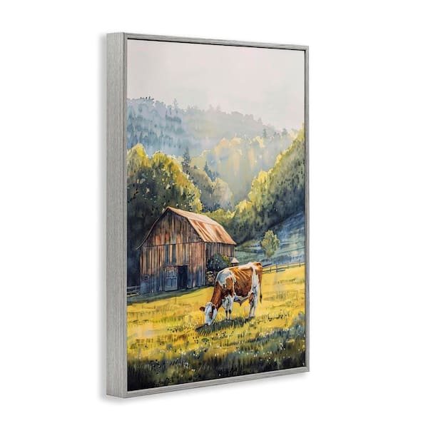 Brown Spotted Cow Grazing by Franklyn Gregory Gray Framed Nature Giclee Art Print 24 in. x 16 in.