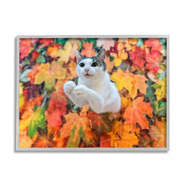 Cat in Autumn Leaf Pile by Kazutoshi Ono 1-Piece Framed Graphic Print Animal Poster Art Print 30 in. x 24 in.