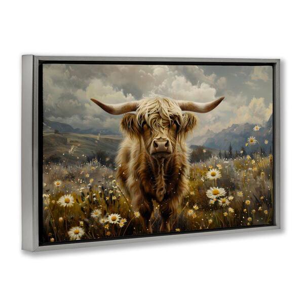 Cattle in Daisy Field by LSR Design Studio Gray Floater Frame Animal Graphic Art Print 21 in. x 31 in.