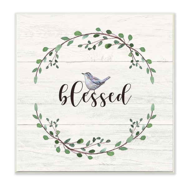 Charming Blessed Phrase Blue Bird and Wreath by Elizabeth Tyndall Unframed Print Abstract Wall Art 12 in. x 12 in.