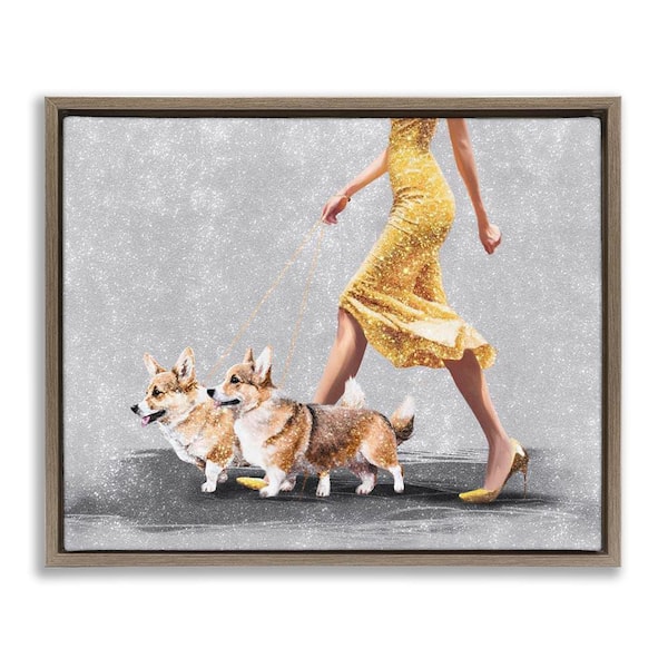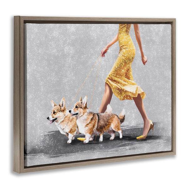 Chic Woman with Corgis by Svetlana Aleynikova Brown Floater Frame People Graphic Art Print 17 in. x 21 in.