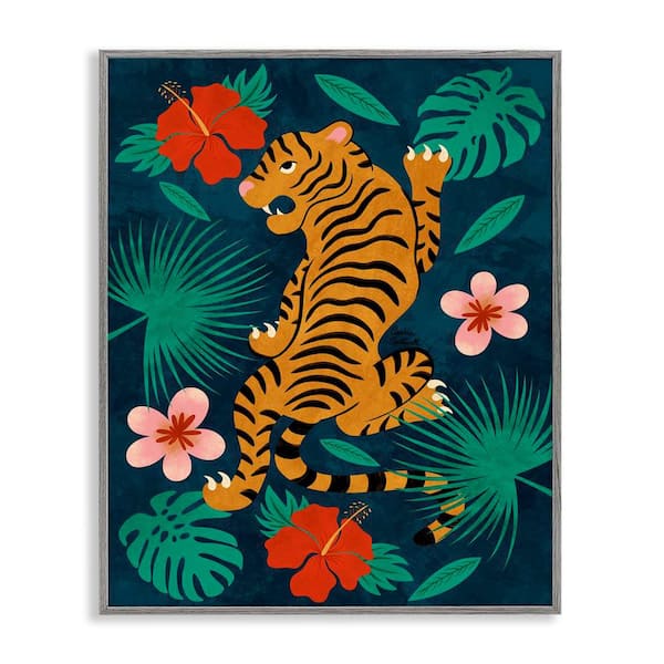 Climbing Tiger Tropics by Carrie Cantwell Gray Framed Animal Giclee Art Print 30 in. x 24 in.