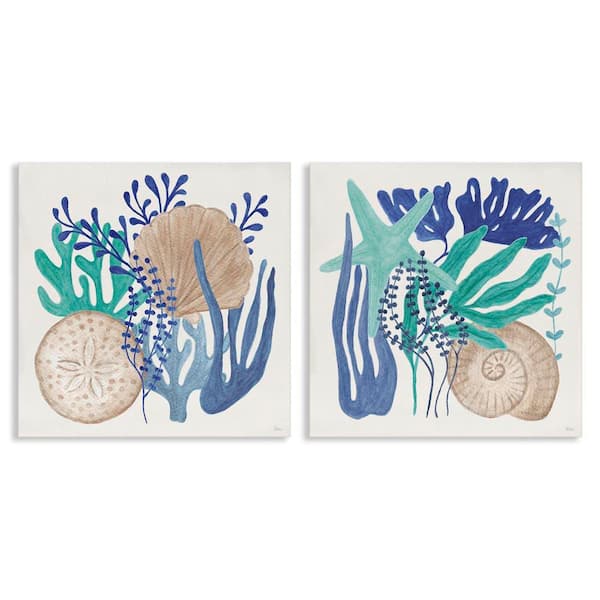 Coastal Coral & Seashells by Veronique Charron 2 Pieces Unframed Coastal Graphic Art Print 24 in. x 24 in.