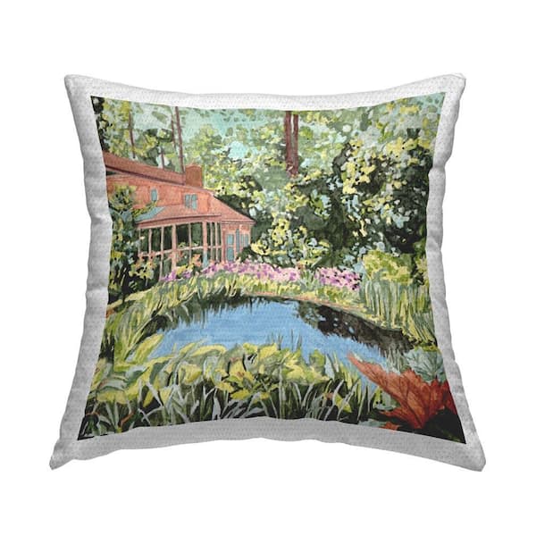 Cottage with Garden Pond Outdoor Printed Throw Pillow by Melissa Wang