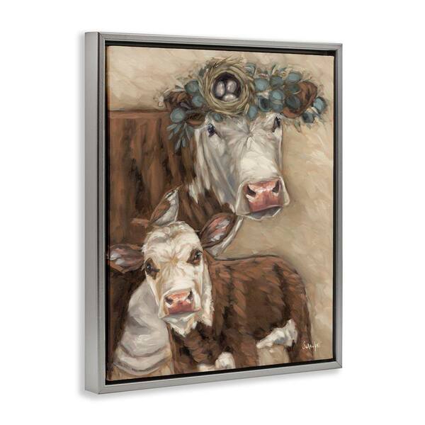 Cow and Calf with Bird Nest by Sara G. Designs Gray Floater Frame Animal Graphic Art Print 21 in. x 17 in.