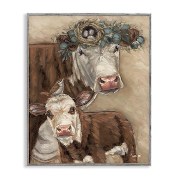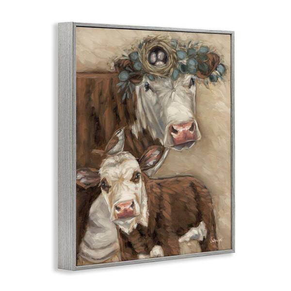 Cow and Calf with Bird Nest by Sara G. Designs Gray Framed Animal Giclee Art Print 30 in. x 24 in.