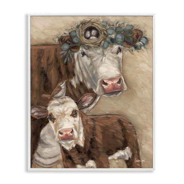 Cow and Calf with Bird Nest by Sara G. Designs White Framed Animal Giclee Art Print 20 in. x 16 in.