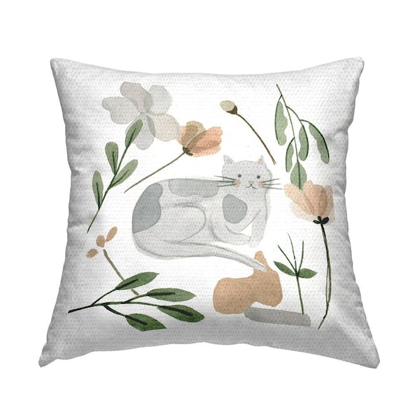 Cozy Gray Cat Flower Petal Botanicals Multi-Color Square Outdoor Throw Pillow