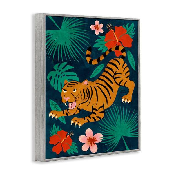 Crouching Tiger Tropics by Carrie Cantwell Gray Framed Animal Giclee Art Print 14 in. x 11 in.