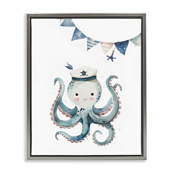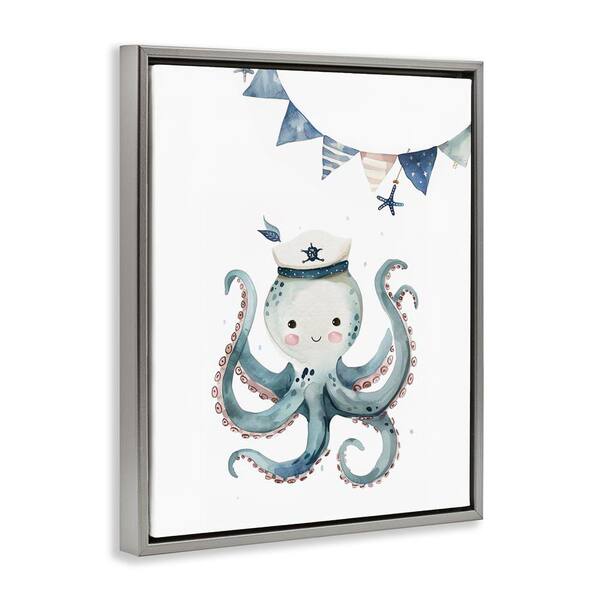 Cute Octopus Sailor by LSR Design Studio Gray Floater Frame Animal Graphic Art Print 31 in. x 25 in.
