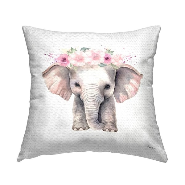 Elephant and Pink Flowers Grey Square Outdoor Throw Pillow