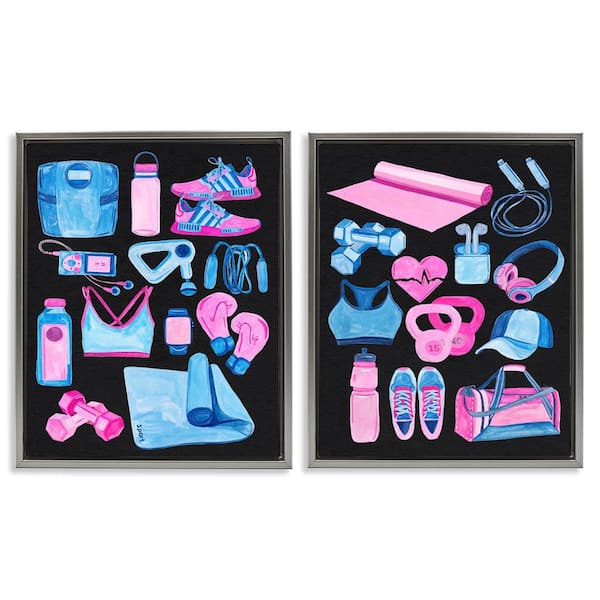 Exercise Gear Pink and Blue by Melissa Wang 2-Pieces Gray Floater Frame Sports Graphic Art Print 31 in. x 25 in.