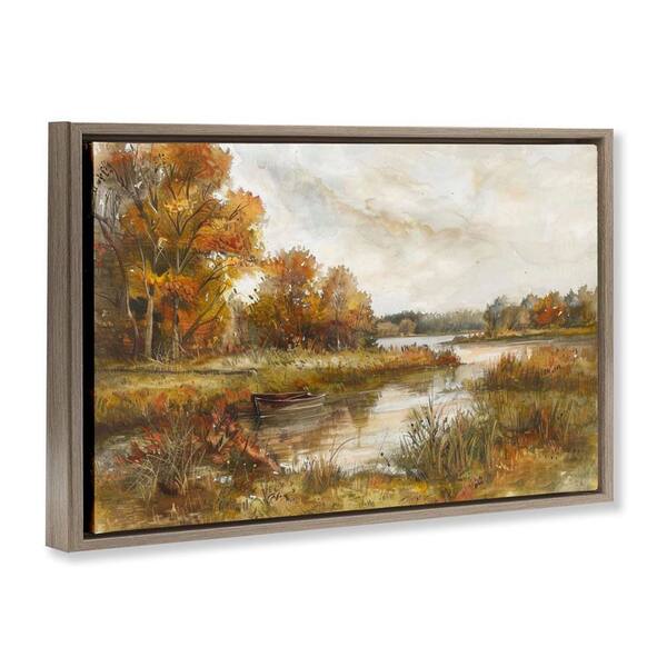 Fall Scenic River Boat by LSR Design Studio Brown Floater Frame Nature Graphic Art Print 21 in. x 31 in.