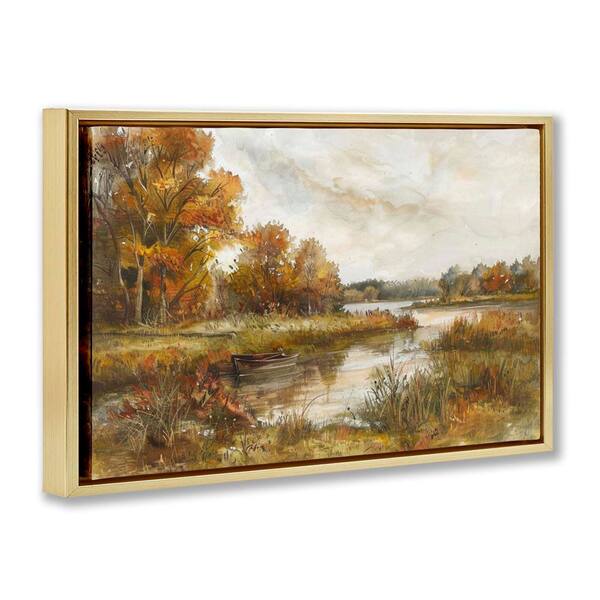 Fall Scenic River Boat by LSR Design Studio Gold Floater Frame Nature Graphic Art Print 17 in. x 25 in.