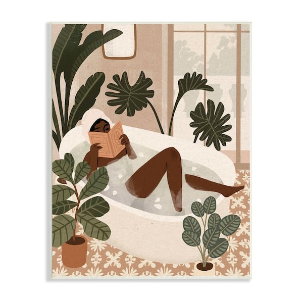 "Female Reading in Bath Tropical Palm Plants" by Victoria Barnes Unframed Typography Wood Wall Art Print 13 in. x 19 in.
